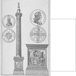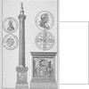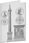 The Monument, City of London, 1760. Depiction of the Monument and a detail of a relief on its west side, with images of coins from King Charles II's reign.