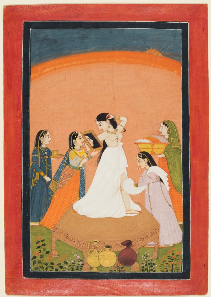 The Morning Toilette, 1810-25. The woman featured in the center embodies the poetic ideal of a female beauty, called a nayika, which translates as "heroine," though she is not an individual from a specific story. In this scene four handmaidens attend to her after the bath. One dries her leg with a white cloth, and another brings her garments for the day folded neatly in a basin. A third holds a mirror for her to use while putting on her jewelry, selected from the box brought by the fourth attendant. The pots of bath water are amid the flowering plants in front of the hexagonal stool on which she stands. The kings of Chamba, a territory deep in the western Himalayas, employed artists from their neighboring kingdom of Guler to create paintings such as this for their royal collections to be viewed for enjoyment in private court gatherings of men and women. Stylistically, Guler artists had close links with imperial Mughal painting traditions prevalent in the Punjab plains to the west, which resulted in the relatively naturalistic setting and figural proportions.