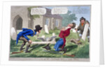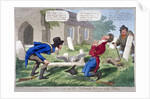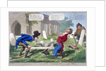 'The murder'd cherub, or the cockney's distress at the bloody-deed', 1804. Two men, who have been shooting, look in horror at a dead owl, believing it to be a cherub. A yokel with a dog on the right watches the scene with bemusement.