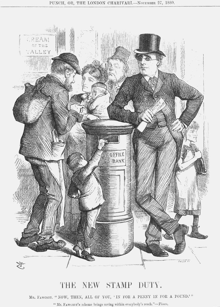 'The New Stamp Duty', 1880. The gentleman in the dark glasses is Mr Henry Fawcett, the blind Postmaster General. He had just introduced a scheme whereby small amounts could be saved in the Post Office Savings Bank by the accumulation of stamps. Twelve penny stamps could be put on one sheet and received as a deposit of one shilling. The little boy is posting his savings, but the little girl on the right has been sent by her more feckless parents to fetch a bottle of beer with their money. From Punch, or the London Charivari, November 27, 1880.