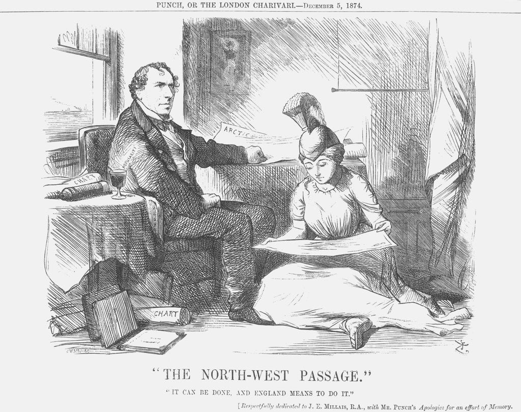 The North-West Passage, 1874. Mr Disraeli, the Conservative Prime Minister, looks thoughtfully into the distance. Charts and maps are spread out around him and at his elbow is the drink of Popularity. Britannia sits at his feet. This relates to the decision by Disraeli's government to undertake another attempt to complete the mapping of the Northwest Passage through the archipelago that stretches from the North American mainland towards the North Pole. It was a dangerous enterprise, not just because of the geographical difficulties that would have to be overcome. The weather and the sea ice had also to be contended with. From Punch, or the London Charivari, December 5, 1874.