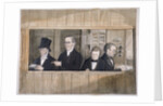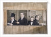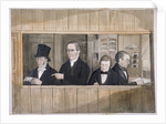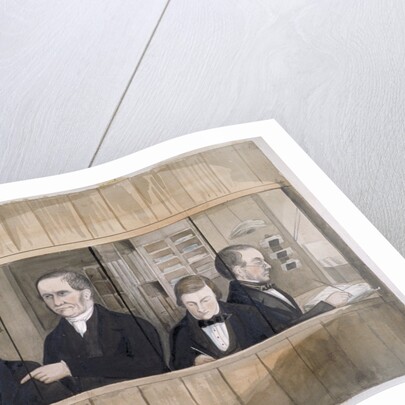 The office of Messre Charles Greenwood and Co, London, c1840. Interior view showing two seated figures writing and another two standing to their right.