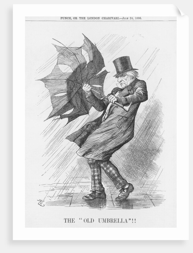 'The Old Umbrella!!!', 1886. This cartoon shows the former Prime Minister, William Gladstone. The Liberal Party had recently lost the General Election to the Conservatives, and their leader, Lord Salisbury had been invited by Her Majesty, Queen Victoria, to form a government. The Liberals had experienced much dissent within their party, with the Radicals distancing themselves from Gladstone's Irish Home Rule Bill. However, should the Liberals reunite under the 'Liberal Umbrella', then they would have a majority in the House. From Punch, or the London Charivari, July 24, 1886.