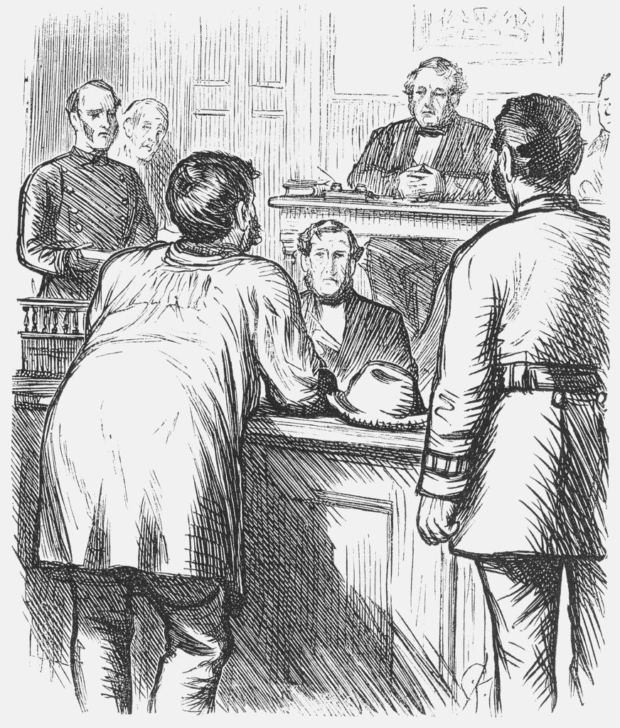 'The Police and the Public', 1874. A labourer faces the court to make a complaint against the constable standing next to him. It appears that being 'taken unawares' was what constituted police brutality in 1874. From Punch, or the London Charivari, March 28, 1874.
