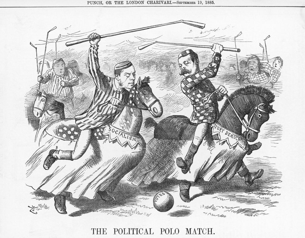 'The Political Polo Match', 1885. Mr Joseph Chamberlain, from the Radical group within the Liberal Party, and the Conservative Lord Randolph Churchill, battle it out on the polo field. Churchill had recently said in a speech that, whilst he disagreed with almost all of Chamberlains political views, he saw him as an honest politician. However, the intense spirit of competition between the two politicians persisted, despite their acknowledged respect for each other. From Punch, or the London Charivari, September 9, 1885.