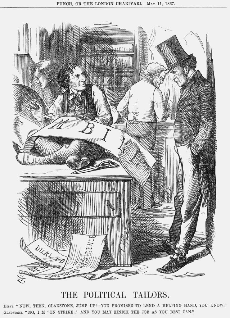 'The Political Tailors', 1867. Gladstone is slumped against the wall with his hands in his pockets. Meanwhile, Disraeli stitches busily at the Reform Bill, with Lord Derby in the background with a large pair of scissors in his hand. Disraeli was a Christian, but his father was a Spanish Jew. Punch always highlighted Disraeli's Jewish features, but here the journal takes things a step further by depicting him as a Jewish tailor (an occupation that earned a living for many working-class Jews in London). Gladstone had proposed a number of amendments to the Reform Bill but had been defeated, with some 45 Liberal MPs voting against him. From the on he seemed to lose the upper hand in the fight. From Punch, or the London Charivari, May 11, 1867.