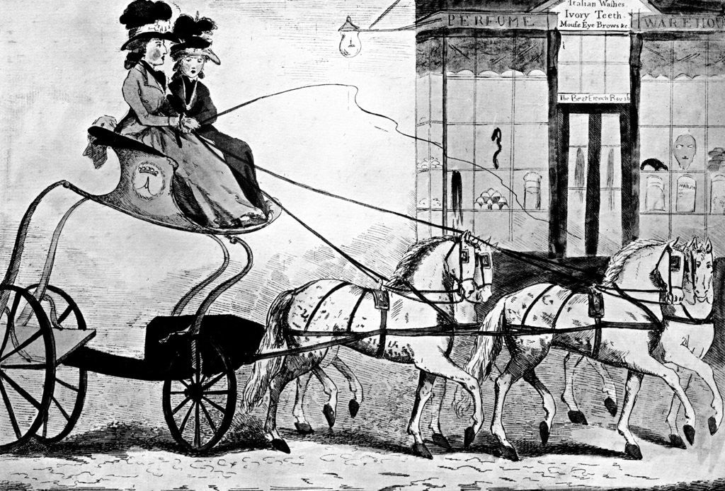 'The Portland Place A- -R. Driving without a beau to R- -D'S perfume warehouse, P-LL, M-LL', 18th century. Illustration from Social Caricature in the Eighteenth Century ... With over two hundred illustrations by George Paston [pseudonym of Emily Morse Symonds], (London, 1905).