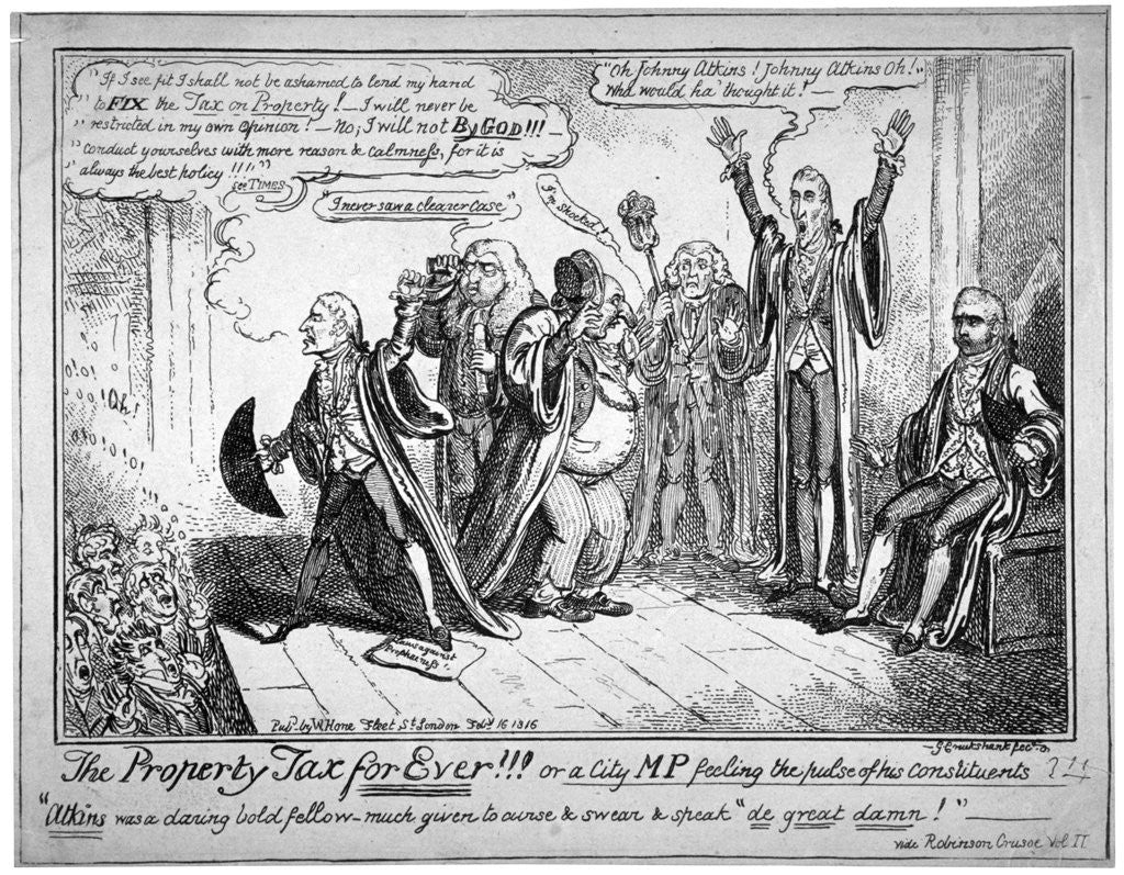 'The property tax for ever!!!', 1816. A scene in the Guildhall. Alderman John Atkins is haranguing the audience on the matter of the income tax. Sir William Curtis is wearing sailor's trousers. The Recorder Sir John Silvester is holding a spyglass and the Mayor Matthew Wood is registering disapproval.