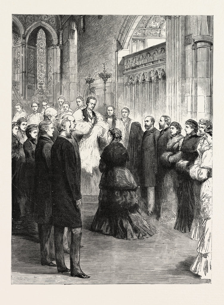The Queen at the Public Christening of the Infant Duke of Albany in Esher Church, Engraving 1884, UK, Britain, British, Europe, United Kingdom, Great Britain, European