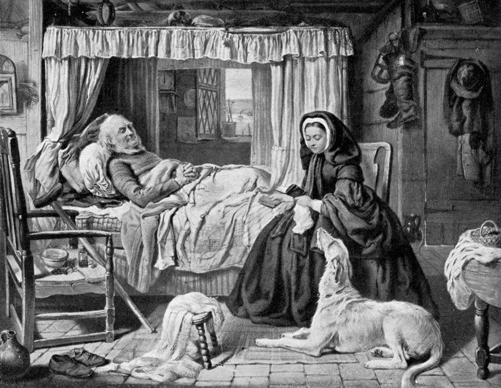 'The Queen in a Cottage Bedroom', late 19th century, (c1920). Queen Victoria reads the Scriptures at the bedside of a sick fisherman, living on her Osborne estate. Illustration from Story of the British Nation, Volume IV, by Walter Hutchinson, (London, c1920s).