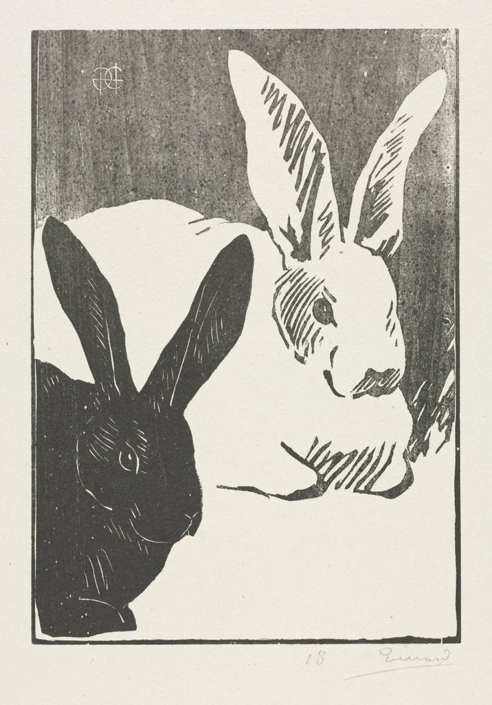 The Rabbits, 1893. Since Guérard was described as the "Japonais de Paris" (Japanese of Paris), it is appropriate that the stylistic source for The Rabbits would be the Japanese artist Katsushika Hokusai (1760-1849), who made many woodcuts of animals.