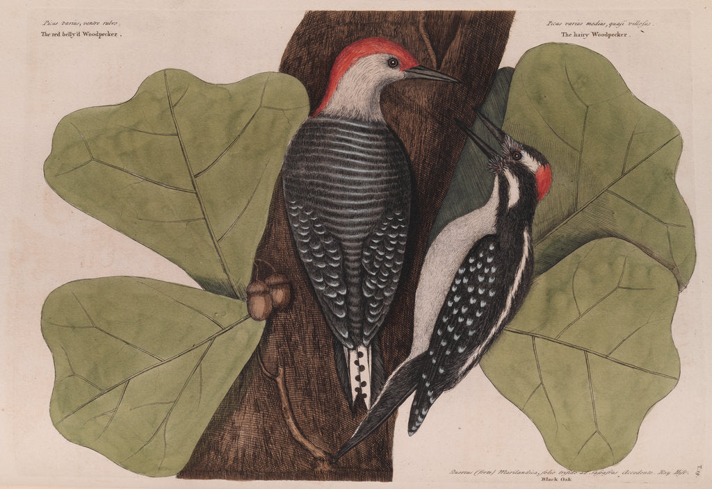 'Picus ventre rubo', the red-bellied wood-pecker, and 'Picus medius quasi villosus', the hairy wood-pecker, perched on the trunk of 'Quercus (forte) marilandica', the black oak (Catesby's identifications; modern scientific names: Melanerpes carolinus, the red-bellied woodpecker; Picoides villosus, the hairy woodpecker; Quercus marilandica, the blackjack oak). Plate 19 from volume I of The natural history of Carolina, Florida and the Bahama Islands, by Mark Catesby (London, 1731). Mark Catesby was elected a Fellow of the Royal Society in 1733.