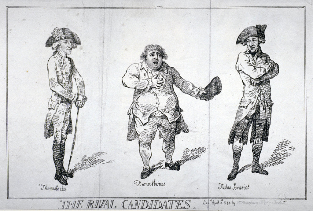 'The Rival Candidates', 1784. The three candidates for the Westminster constituency at the 1784 general election. Charles James Fox in the centre, in the pose of orator, is inscribed Demosthenes; Lord Hood on the left is inscribed Themistocles; and Sir Cecil Wray on the right, with a sly expression, is called Judas Iscariot. A satire on Wray for his desertion of Fox. In a close contest, Hood and Fox won the two available seats with Wray losing out in third place.