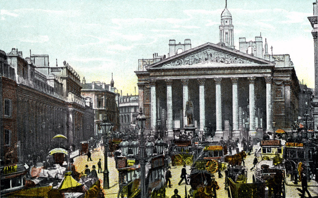 The Royal Exchange, London, 20th Century. The Royal Exchange was established by Sir Thomas Gresham in 1566, with the aim of making London main European market-place. It was named the Royal Exchange by Elizabeth I in 1571. It has been destroyed twice by fire but rebuilt both times on the same site. The building pictured was designed by Sir William Tite in 1842. Postcard from The Souvenir Album, Views of London And The River Thames, From London To Oxford, (London, 20th Century).