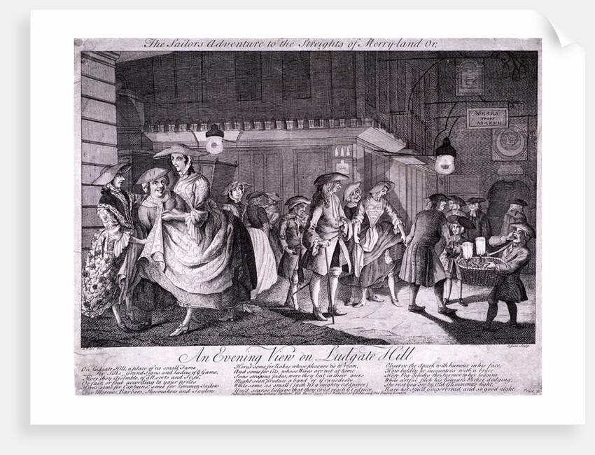 'The sailor's adventure to the streights of Merryland or, an evening view on Ludgate Hill', 1749; showing a seaman fumbling beneath skirts of two women with other figures on the street.