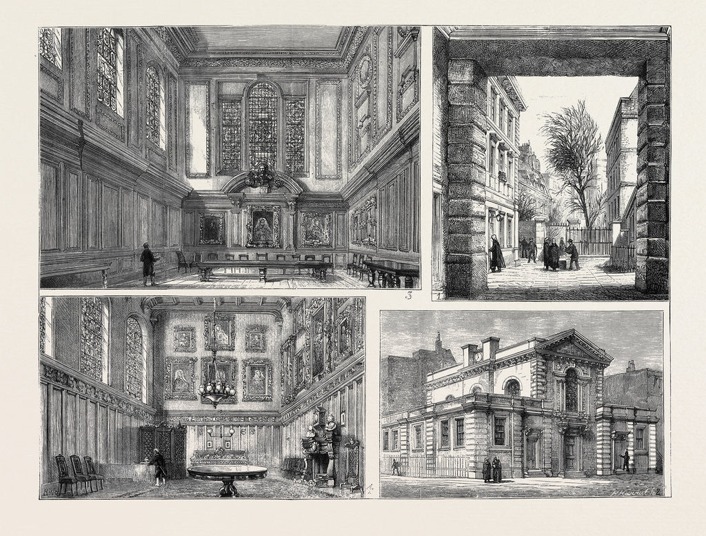 The Sale of Serjeants' Inn: 1. View of the Inn Through Archway Looking from Chancery Lane; 2. Exterior of the Hall; 3. Interior of the Hall; 4. The "Chapel"