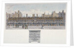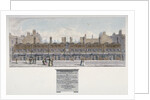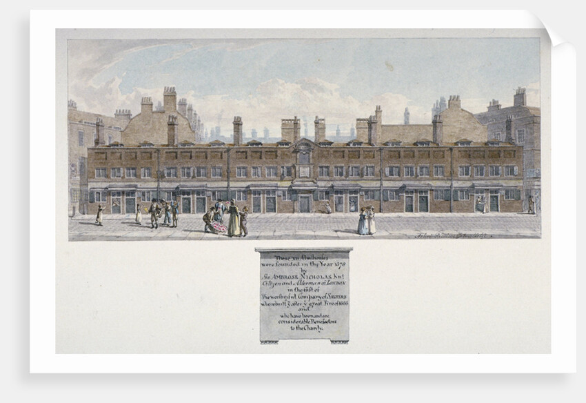 The Salters' Almshouses in Monkwell Street, City of London, 1818. View with a plaque underneath.