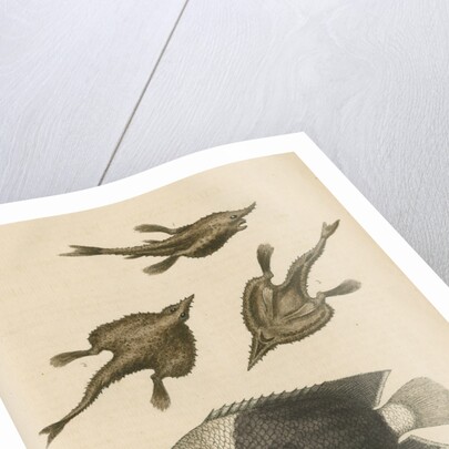 Marine zoological studies of two fishes. Figures 1-3 are three views of the Longnose batfish, Ogcocephalus corniger. Figures 4-5 are referred to as an Acarauna, an unidentified variety of surgeonfish, with a detail of a scale. Plate 283 from chapter 73 of Gleanings of natural history, exhibiting figures of quadrupeds, birds, insects, plants, &c..., by George Edwards, volume 2 (London, for the author, 1760). The plate is inscribed: 'Brasilian Fishes Etched from nature of the Size of Life. G. Edwards Delin; Sculp: etc A.D. 1755.'