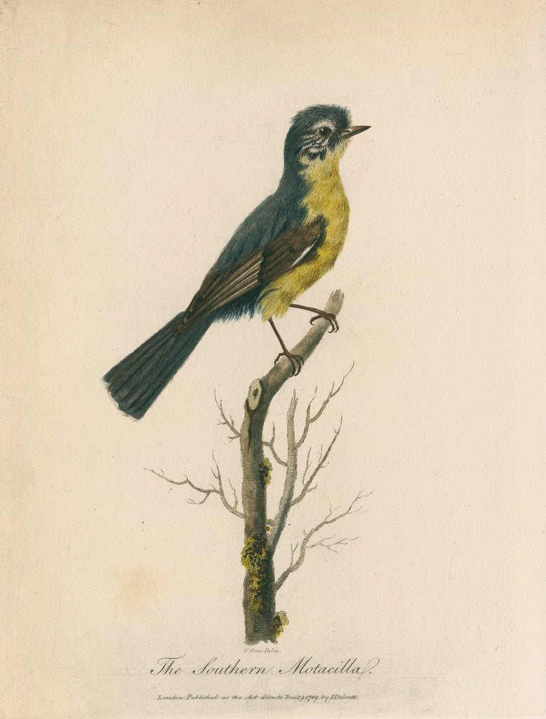 Ornithological study of what may be the Eastern Yellow Robin (Eopsaltria australis) native to Australia. Plate 28 from Journal of a voyage to New South Wales...by John White (J.Debrett, London, 1790). The accompanying text states that: 'It is not perhaps absolutely clear whether this bird should be referred to the genus Motacilla...The bird is about the size of the ...yellow wagtail' The plate is inscribed: 'S.Stone Delin. The Southern Motacilla, London Published as the Act directs Dec: 29, 1789, by I.Debrett.'