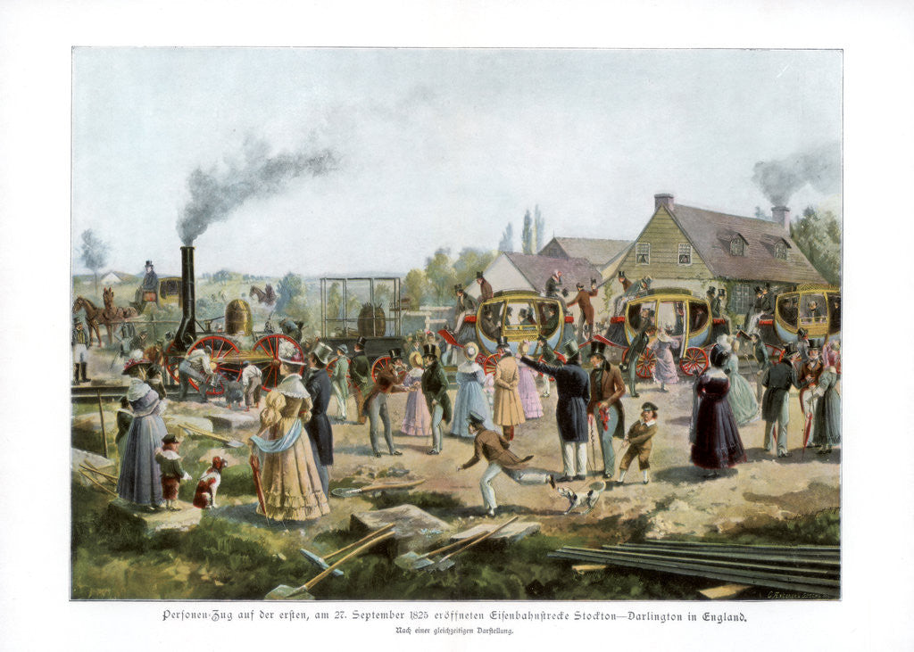 The Stockton & Darlington Railway, 1825 (1900). Opened on 27 September, 1825, the Stockton & Darlington Railway (S&DR) was the world's first public railway. It was built to link the collieries in West Durham and Darlington with the docks on River Tees at Stockton, Durham. At the opening of the railway, large crowds saw chief engineer George Stephenson at the controls of 'Locomotion', the locomotive built by Robert Stephenson & Co, as it pulled 36 wagons to the Stockton Terminus.