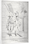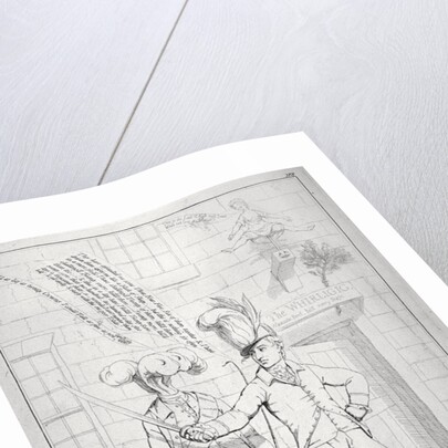 'The Thunderer', 1782. Colonel Tarleton as Bobadil standing holding out a drawn sword. On his right stands the Prince of Wales with a plume of three ostrich feathers in place of a head. They are outside the door of a dubious place of entertainment called the Whirligig.