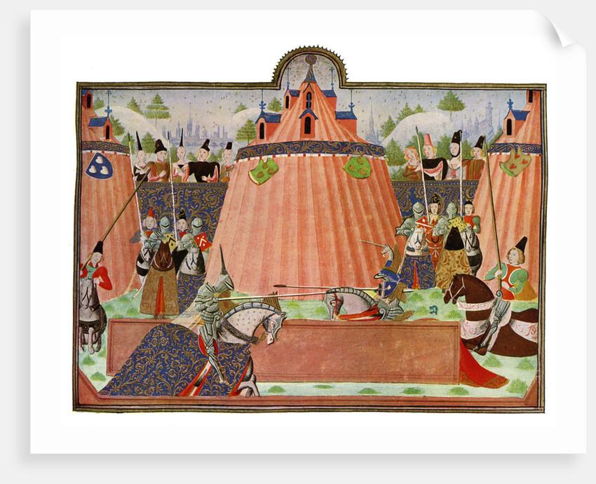 'The Tournament at St Inglevert', France, 15th Century. Jousting scene with ornate tents: knights in armour with lances parade across the field, while the audience looks on. Miniature colour print from The Chronicler of European Chivalry by GG Coulton, (London, 1930).