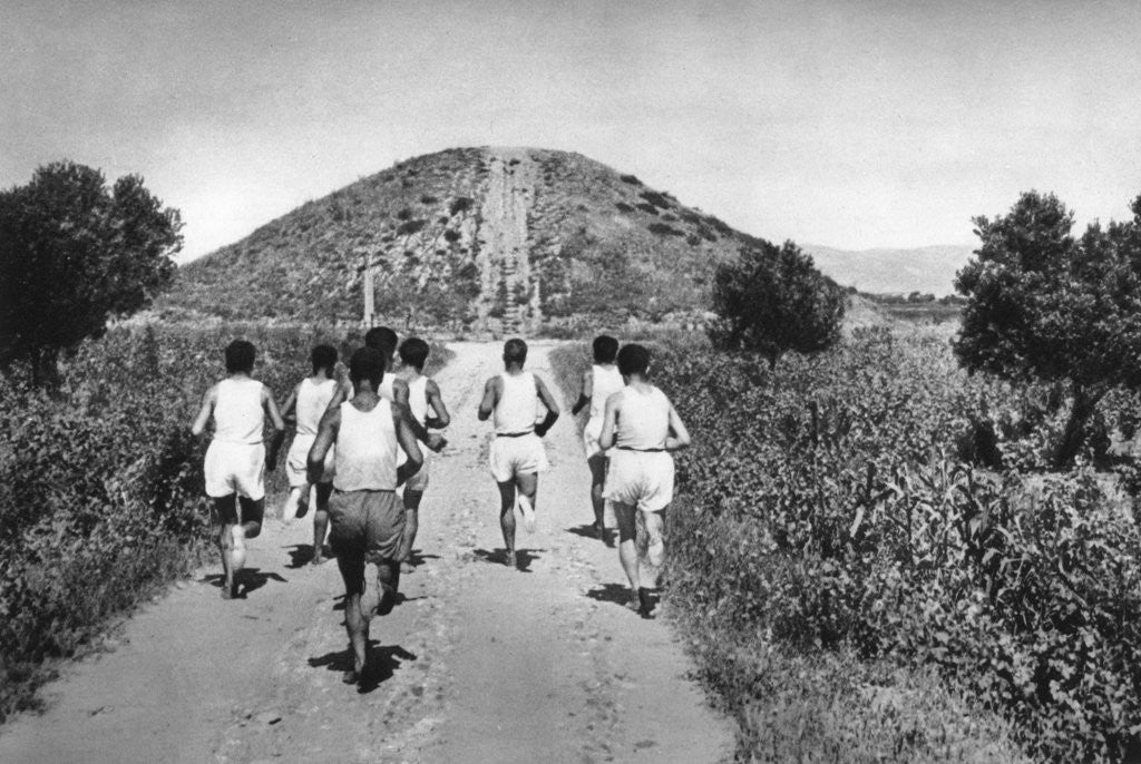 The Tumulus of Marathon, Greece, 1937. Runners in front of the burial mound of the 192 Athenian dead at the site of the battle of Marathon in 490 BC. Illustration from Das Mittelmeer: Landschaft, Baukunst und Volksleben im Kreise des Mittelländischen Meeres, a work on Mediterranean architecture, landscape and people by Martin Hürlimann, (Atlantis-Verlag, Zurich, 1937).