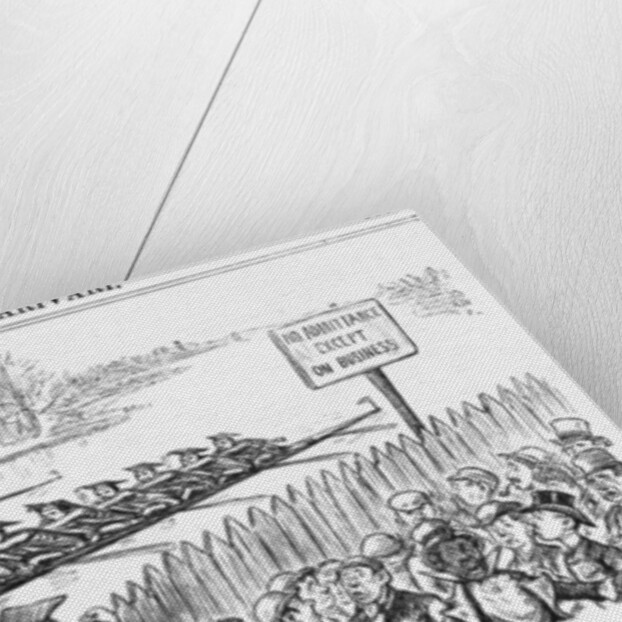 'The Universities' Boat-Race', 1883. In this illustration of the University Boat Race, a group of cheering students are enabled to maintain a proper distance from the rowdy proletariat on the other side of a high fence. From Punch, or the London Charivari, March 17, 1883.