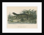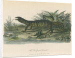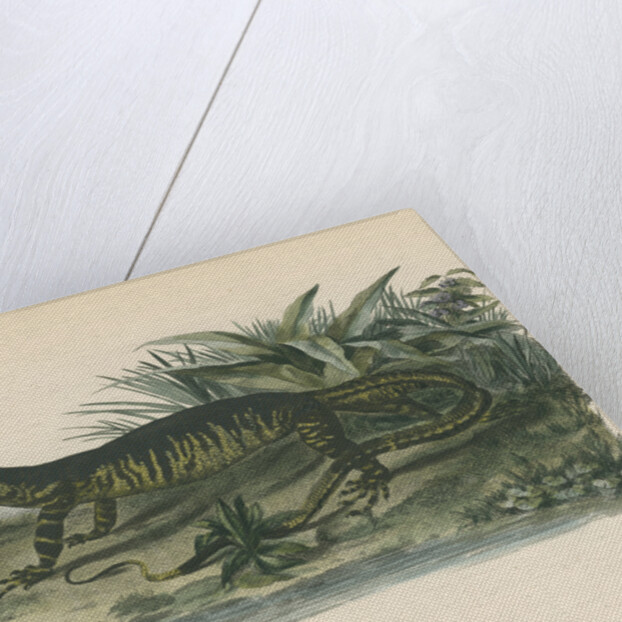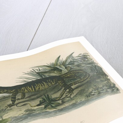Zoological study of the Lace Monitor (Varanus varius) a lizard native to Australia, shown in a landscape that includes a water-lily. Plate 38 from Journal of a voyage to New South Wales...by John White (J.Debrett, London, 1790). The accompanying text states that: 'This Lizard approaches so extremely near to the Lacerta Monitor of Linnaeus, or Monitory Lizard, as to make it doubtful whether it be not in reality a variety of that species...' The plate is inscribed: 'S.Stone delin. The Variegated Lizard. Published as the Act directs Dec: 29, 1789, by J.Debrett.'