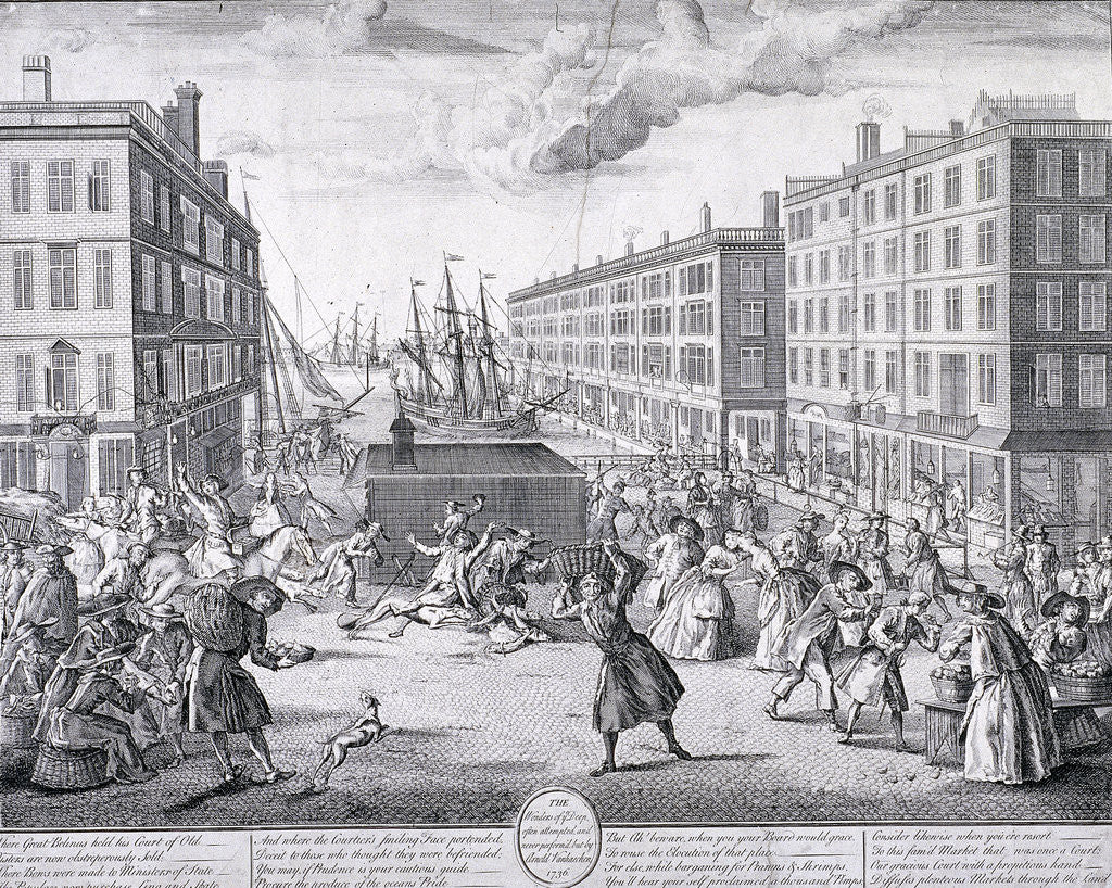 'The view and humours of Billingsgate', 1736. Billingsgate market and wharf, London with ships on the water. Shows market scene in foreground including seafood sellers, men on horseback, dogs, basket carrier, man eating seafood and men smoking pipes. With interior view of fish stalls on right.