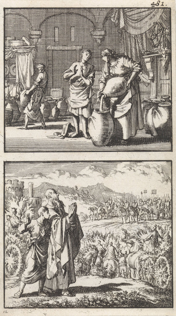 The widow of Zarephath fills the miraculous cruse of oil, Elisa's performance in the war against Syria, Jan Luyken, Barent Visscher, Andries van Damme, 1698