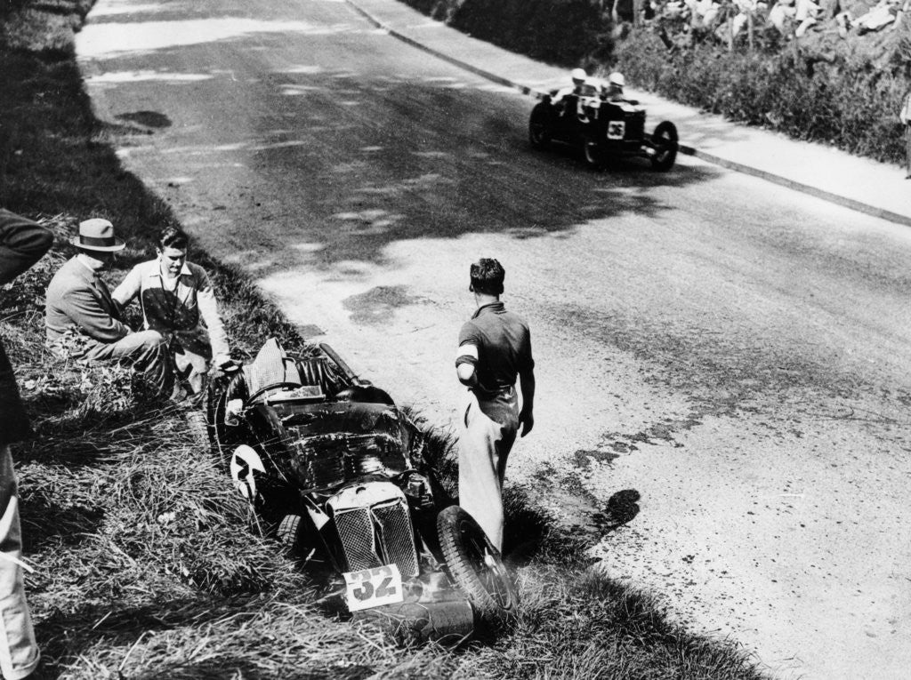 The wreckage of Goldie Gardner's MG J4, Tourist Trophy, Ards-Belfast, 1932. Gardner stands beside his car which crashed on only the third lap of the race.