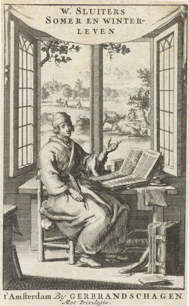 The writer Willem Sluiter at his desk with an open window, print maker: Jan Luyken, Gerbrandt Schagen, Anonymous, 1687