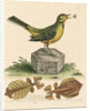 Study of the Yellow Wagtail Motacilla flava in the act of catching an insect. The bird is posed standing upon a stone from Giant's Causeway, County Antrim, Ireland. Below are two studies of a 'Walking Leaf' insect, perhaps a variety of Phyllium, which the author believes was from the West Indies. Plate 258 from chapter 48 of Gleanings of natural history, exhibiting figures of quadrupeds, birds, insects, plants, &c..., by George Edwards, volume 1 (London, for the author, 1758).