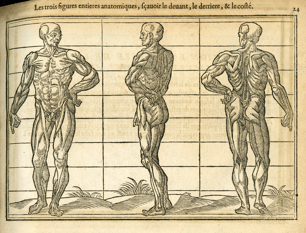 This diagram illustrates three full male anatomical figures; showing the front, side and back views. The background is of a grid format so as to aid the understanding of the proportions. Plate 20 from La Vraye Science de la Pourtraicture Descrite & DemonstrÚe by Jean Cousin (Paris, Francois Demasso, 1663). Inscribed: 'Les trois figures entieres anatomiques sþauoir le deuant, le derriere & le costÚ. 24'