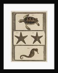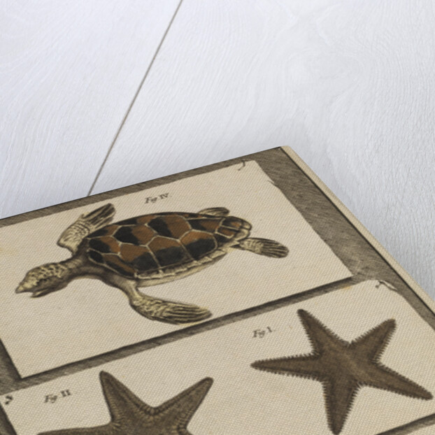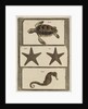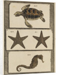 Marine zoological studies of three specimens. Figures 1-2 [centre] upper and lower views of a starfish, 'most common upon our English coast'. Figure 3 [below] sea horse from Italy, 'taken from the Royal Society'. Figure 4 [top] view of a sea-turtle, possibly the Hawksbill turtle Eretmochelys imbricate, 'the first of the finny Race; drawn from Mr. Salter's Collection at the Coffee-House at Chelsea.' Plate 4 from the book A philosophical account of the works of nature, by Richard Bradley (London, 1721). Inscribed 'Plate IV. T.Cole sculp.' Richard Bradley (1688-1732) English botanist and writer, was elected a Fellow of the Royal Society in 1712. Figure 3 on this plate is a specimen from the Royal Society's Repository.