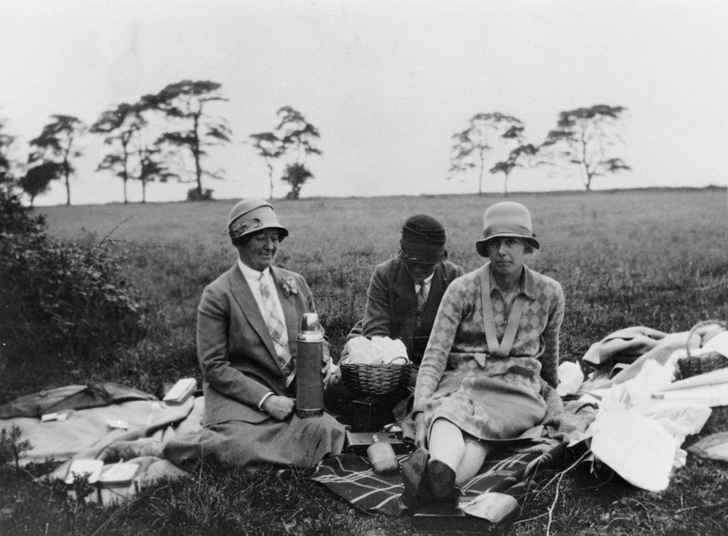 Three women having a picnic in a field, (1920s?). Sitting on picnic blankets with a food basket in the middle. The woman on the left holds a flask.