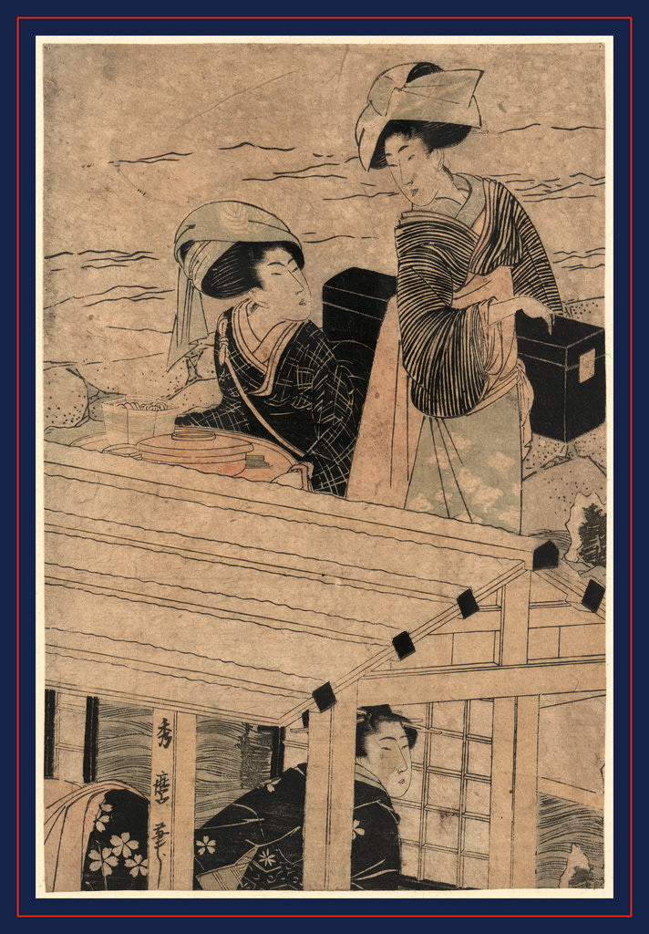 Fuyu No Yanebune, Enjoying a River Cruise in Winter. [Between 1801 and 1804], 1 Print : Woodcut, Color ; 31.5 X 20.7 ., Print Shows Three Women on a Houseboat.