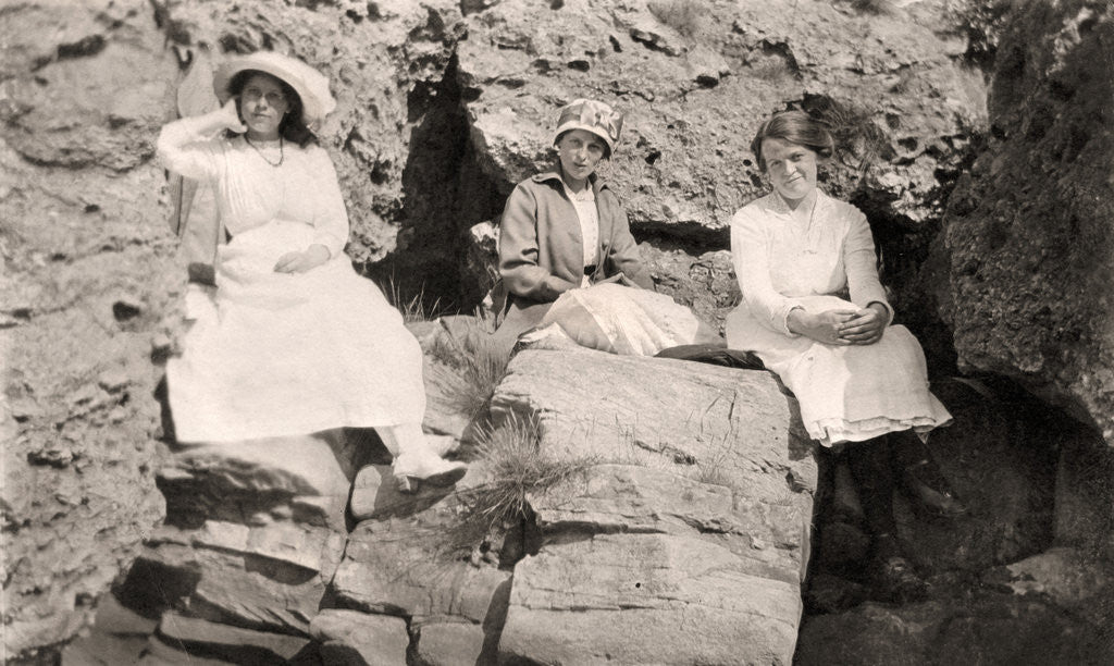 Three women relaxing on rocks, early 20th century.