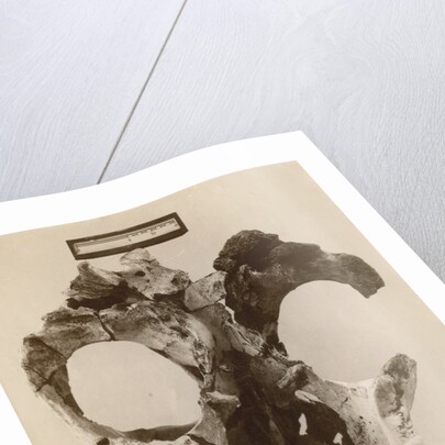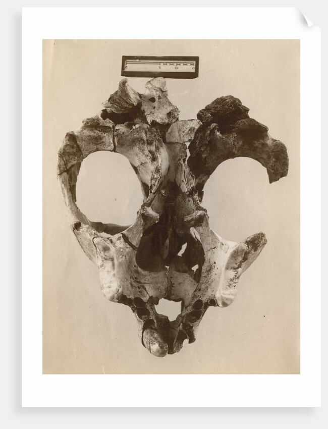 Photograph of the fossilized skull of an Australian carnivorous marsupial from the genusThylacoleo, the 'Pouch Lion', probably Thylacoleo carnifex. The specimen is shown with an accompanying scale. One of eight photographs sent to the Royal Society by the Australian Museum, Sydney. The photographs are endorsed as being received 13 September 1889. The receipt of these items coincided with the loan to the Royal Society of an original skull by the Department of Mines, Sydney, which was examined by the zoologist Edwin Ray Lankester (1847-1929). This was apparently in support of the refereeing of a paper submitted to the Philosophical Transactions by Richard Owen FRS (1804-1892).