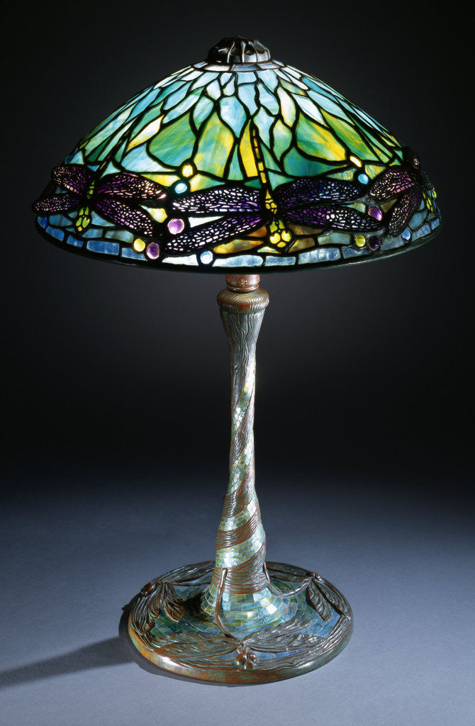 Product details Tiffany Studios 'Jeweled Dragonfly' leaded glass, bronze and mosaic glass table lamp