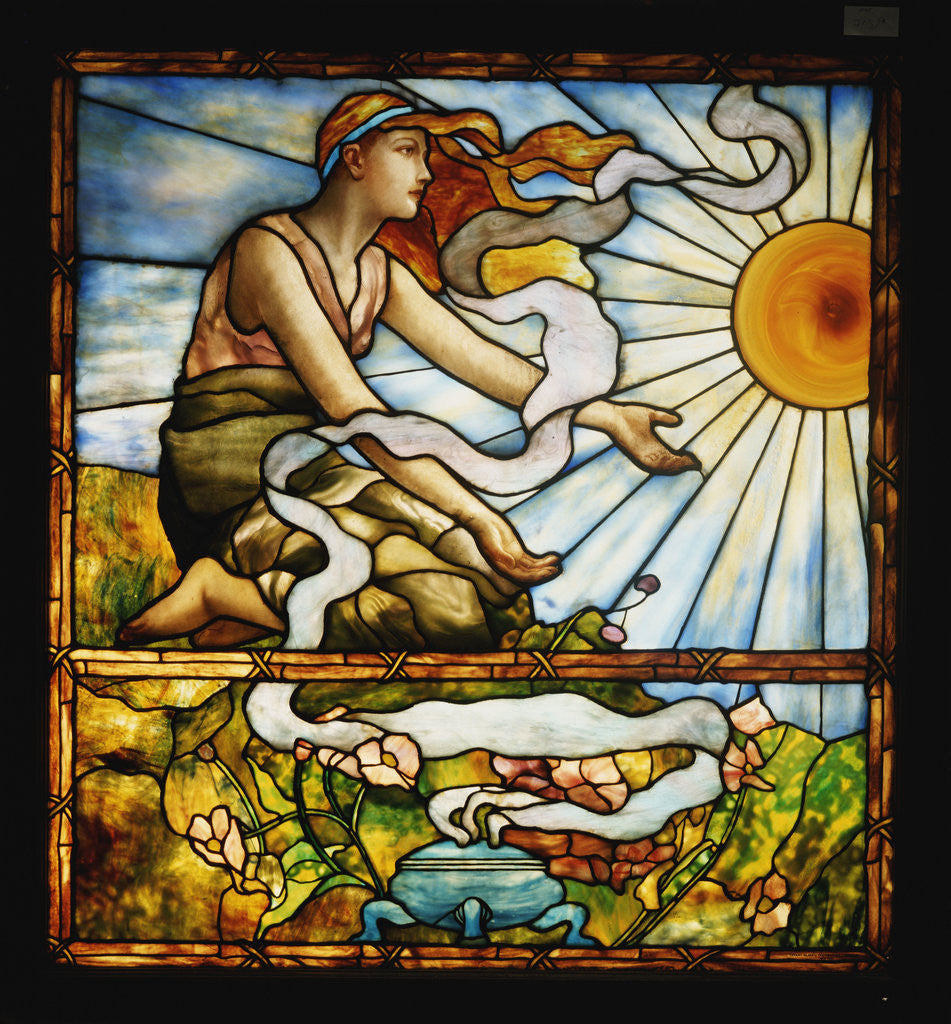 Product details Tiffany Studios leaded and plate glass window depicting a young woman kneeling before the rising sun