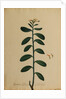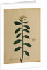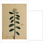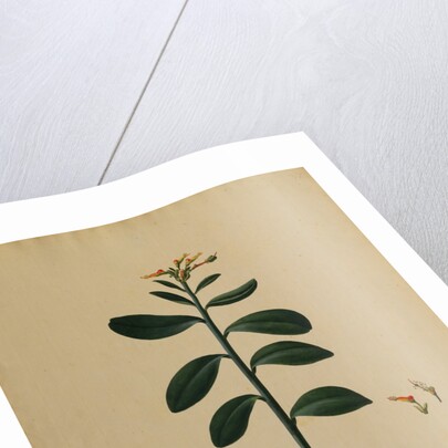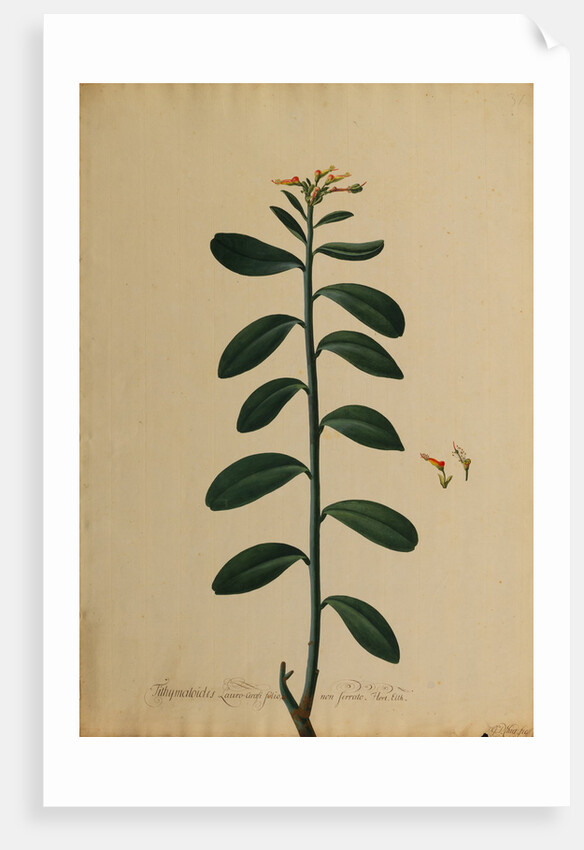 Botanical study of Tithymaloides lauro-cerasi folio, non ferrato [modern taxonomy Pedilanthus tithymaloides, also known by names including Euphorbia tithymaloides and the myrtle-leaved spurge. native to tropical and subtropical North America and Central America. The study shows the stalk, leaves and flower of the perennial succulent plant, with further detail of two flowers, one partially open, and one revealing the stamen. Original: ink and watercolour on paper. c.1735.