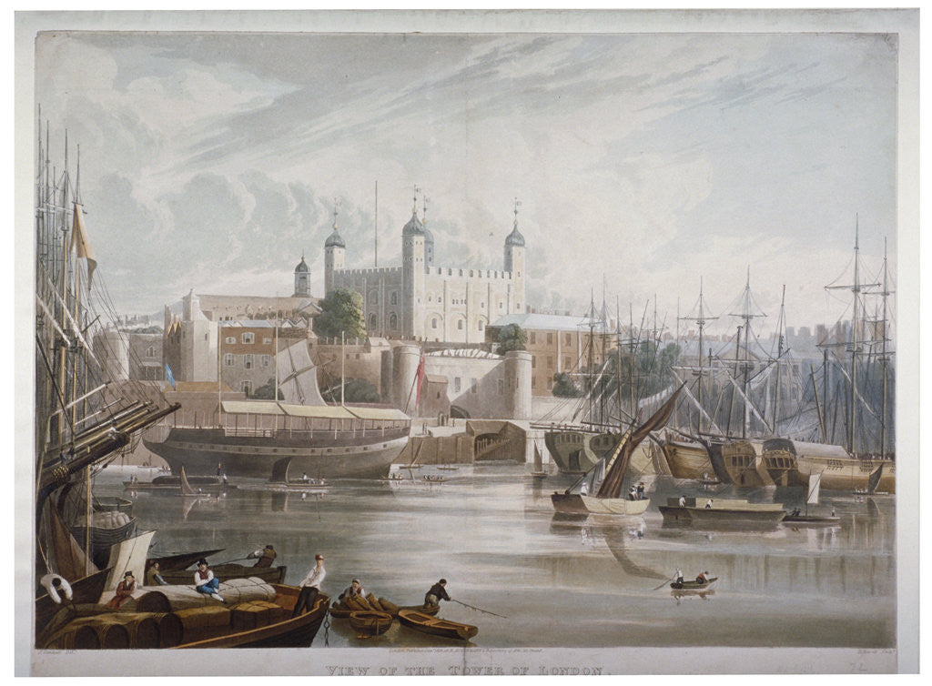 Tower of London, 1819. View from the River Thames with boats and passengers on the river.
