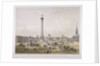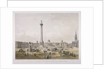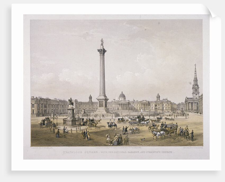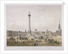 View of Trafalgar Square, Westminster, London, 1852, looking towards the National Gallery. The Church of St Martin-in-the-Fields and Nelson's Column can also be seen, as well as horse drawn carriages passing around the square, soldiers on horseback and pedestrians.