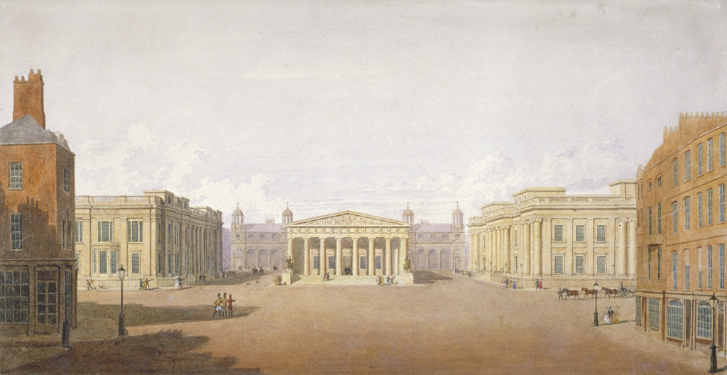 Trafalgar Square, Westminster, London, 1828. View showing the design for a building to house the Royal Academy of Arts with King's Mews in the distance.