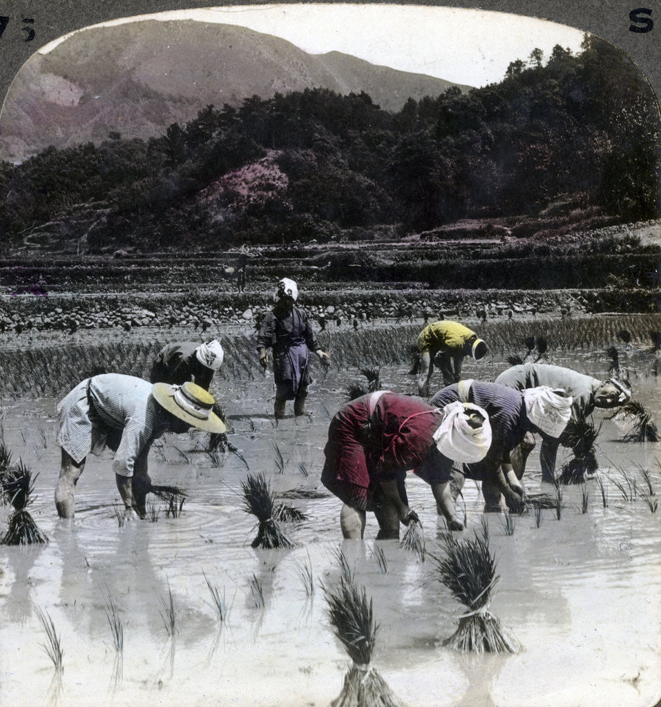 Transplanting rice in a paddy field, Japan, 1904. Stereoscopic card. Detail. From a series called Notes of Travel.
