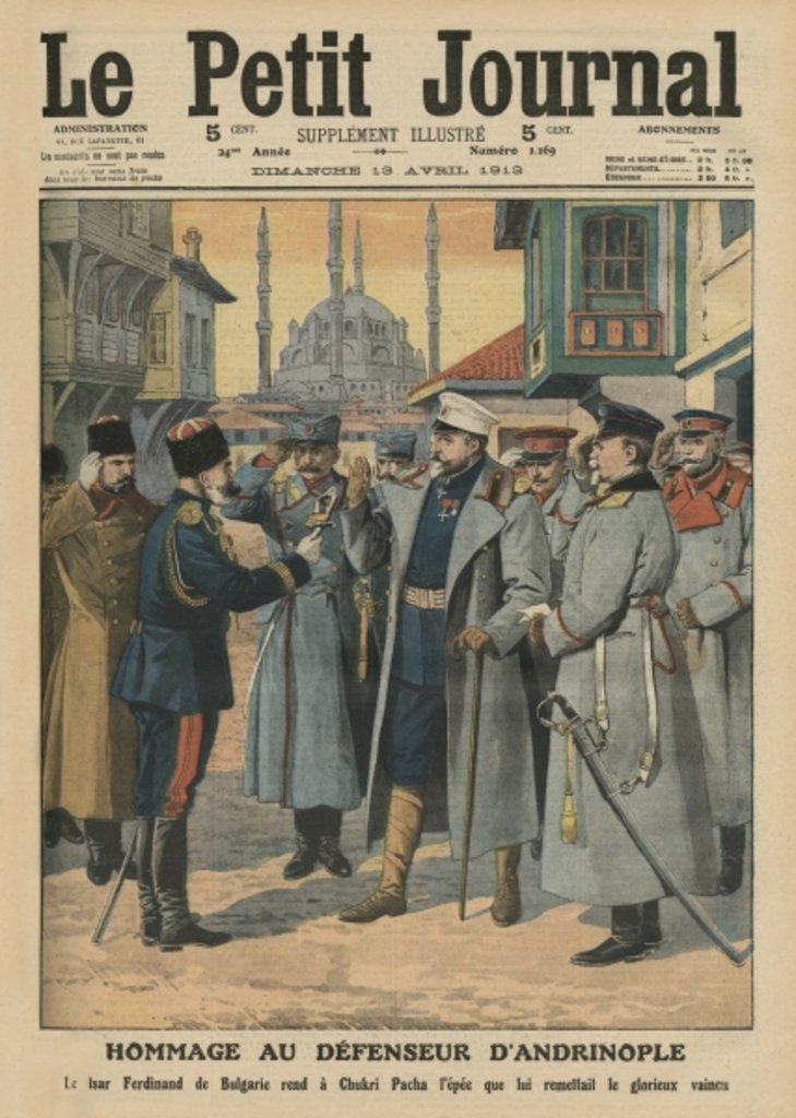 Czar Ferdinand I of Bulgaria gives back to Shukri Pasha the sword of the glorious defeated, front cover illustration from 'Le Petit Journal', supplement illustre