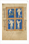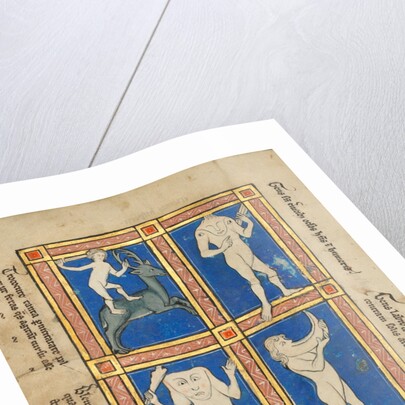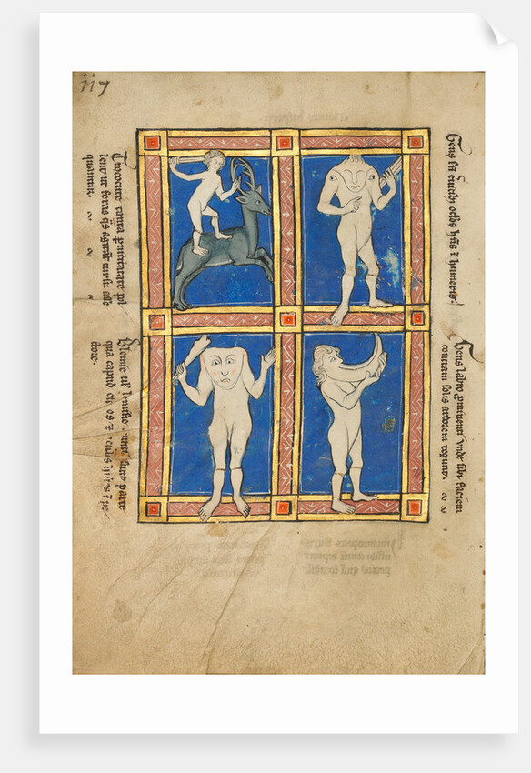 Trococite, A Headless Man with Eyes on His Shoulders, A Headless Man with a Face on His Chest, A Man with a Large Under Lip; Unknown; Thérouanne ?, France (formerly Flanders), Europe; fourth quarter of 13th century (after 1277); Tempera colors, pen and ink, gold leaf, and gold paint on parchment