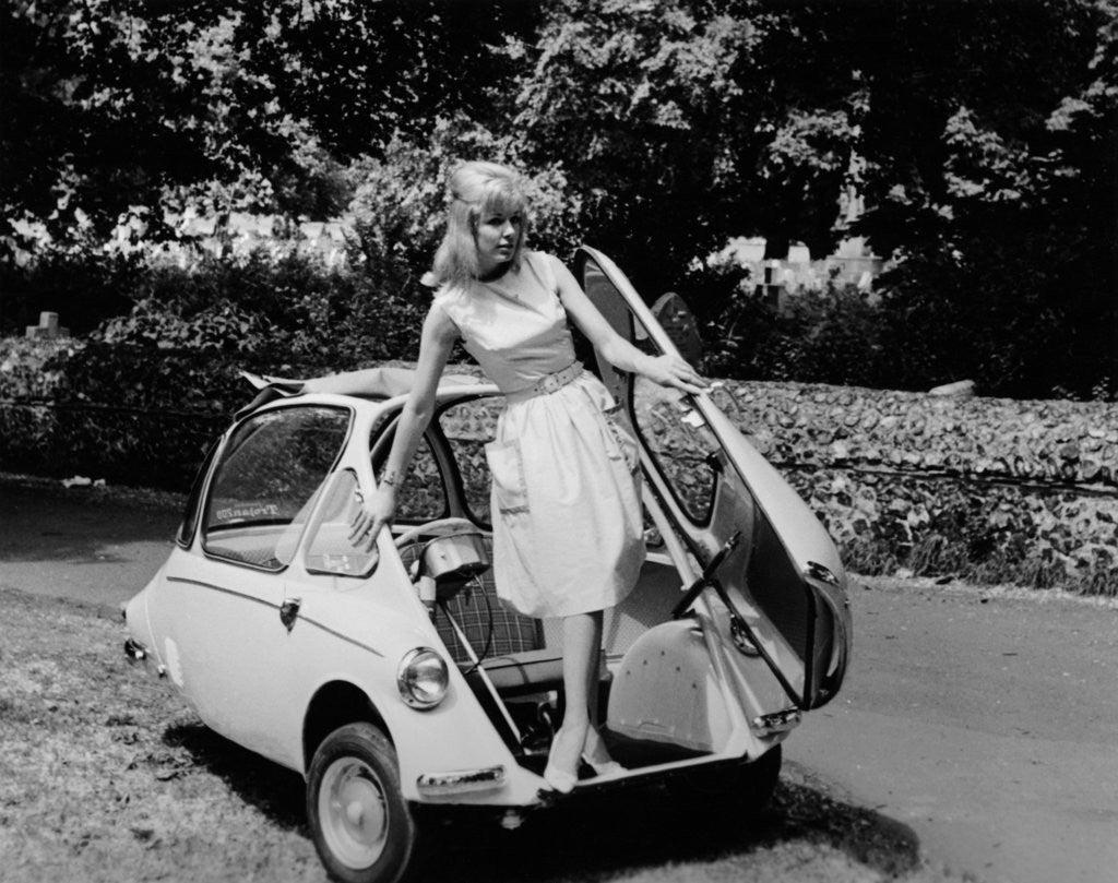 Trojan 'Bubble Car', c1962. The Trojan 200 3-wheeler was advertised as a 'Young-family car to suit the young-family pocket'. It cost £329 pounds, 17 shillings and sixpence, and the tax cost £6 a year. 2 adults and 2 children could fit into it, and it had a cruising speed 50 mph. It was economical, doing 80 miles to the gallon. Collectors' items now sell for £3,000. It had no reverse gear, and the only door was at the front.